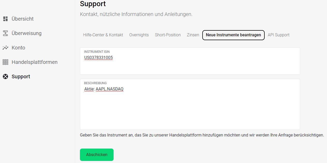 Beantragen Sie die Hinzufügung eines neuen Instruments in Ihrem Kundenbereich