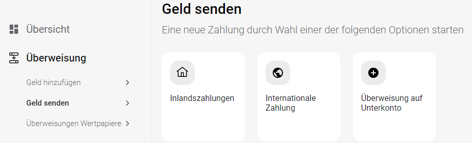 Klicken Sie auf die Registerkarte "Überweisungen" -> "Geld senden" und wählen Sie die gewünschte Abhebungsmethode.