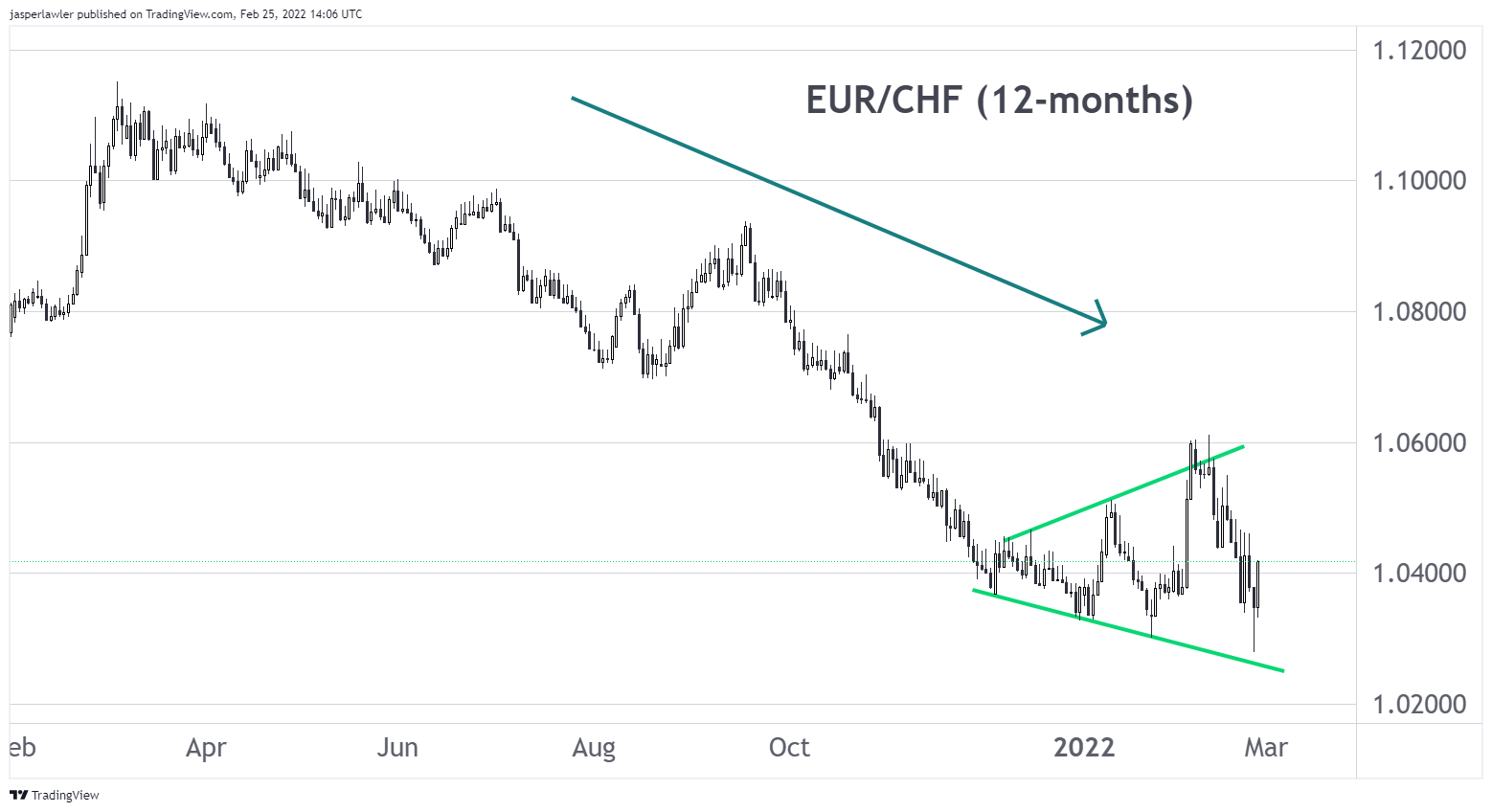 Die EUR/CHF-Paarung verzeichnete in den letzten 12 Monaten einen Rückgang von 7 %, da der Kurs von einem Hoch im März letzten Jahres bei 1,11500 auf den heutigen Stand von 1,0350 fiel. Allein seit Anfang Februar notiert das Paar über 2 % niedriger.