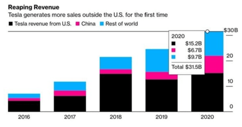 Da die chinesische Regierung die Einführung von Elektrofahrzeugen in ganz China subventionieren will, expandiert Tesla auch ausserhalb der Megastädte. Im Nordosten Chinas eröffnete das Unternehmen Vertriebszentren in Weifang und Linyi. Das Engagement im Reich der Mitte scheint sich auszuzahlen: 2020 überstiegen Teslas Verkäufe ausserhalb der USA zum ersten Mal die Inlandsverkäufe – vor allem dank China (siehe Grafik).