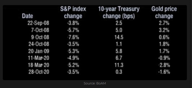Only happened twice since 1990 - both in March of this year. Chart shows the few days that the S&P 500 is down 3.5% and yields up (removing the gold criteria) - Source: BofA, The Market Ear
