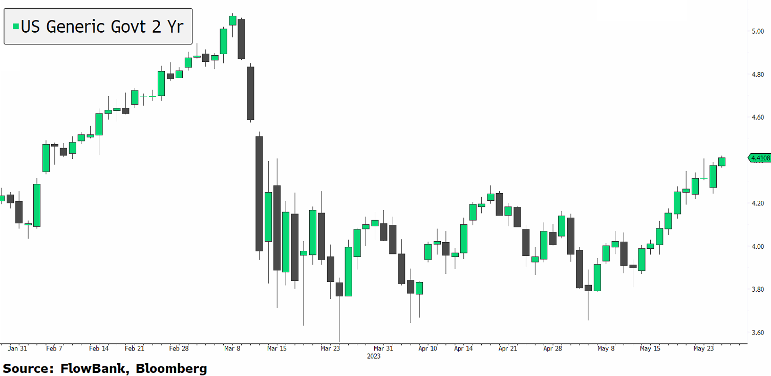 US Treasury yields have rebounded with the 2-year rising for 10th sessions in a row. Markets are concerned about: the path of inflation and labor, the Fed, and the debt ceiling. Traders may also lighten up positions as we approach the long weekend, but for now, at least in the Nasdaq, investors are cheering Nvidia's massive jump post-earnings.