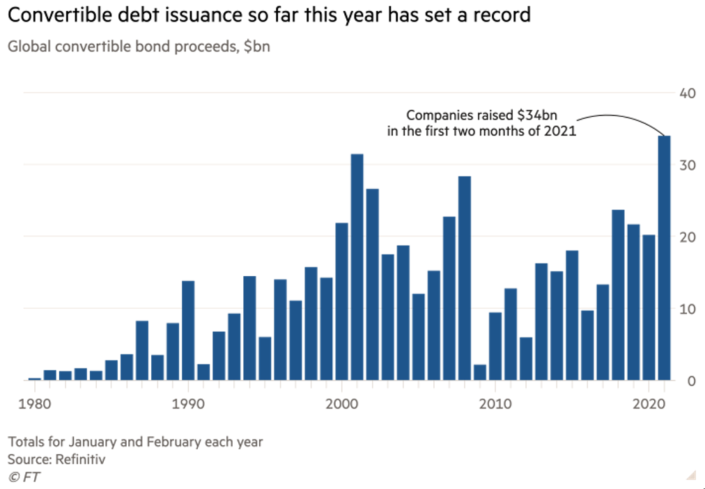 Airbnb on Tuesday announced a $2bn convertible deal, the biggest of the year so far, on the heels of Twitter, which announced a $1.25bn convertible bond issue on Monday and Spotify, which priced $1.3bn in notes last week. Beyond Meat increased the size of a convertible bond issue on Tuesday from $750m to $1bn. Source: Financial Times
