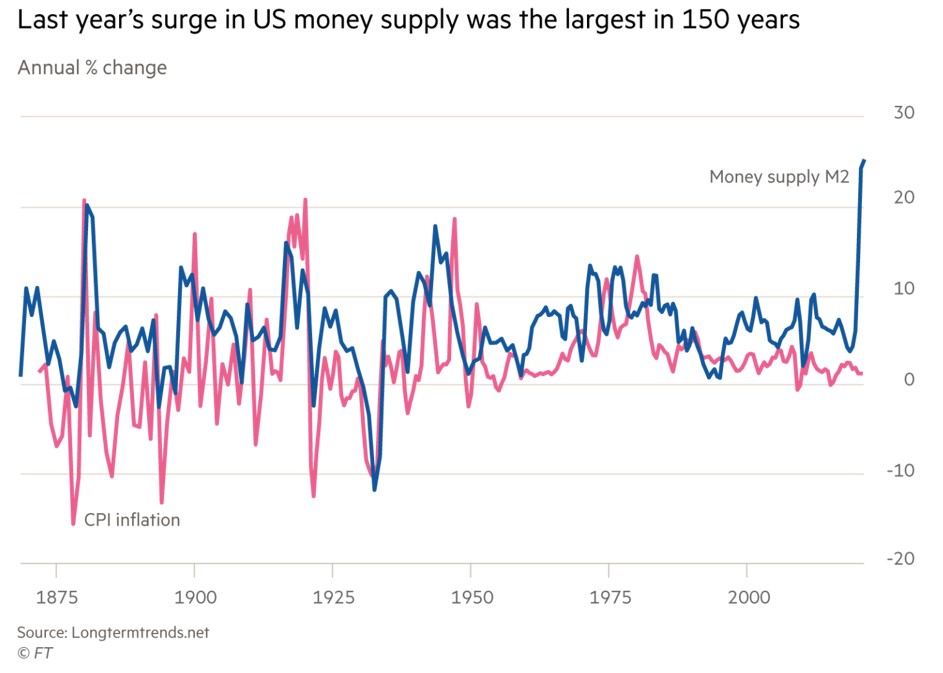 Never seen this uptick in M2 supply. Biden will likely increase fiscal stimulus. Siegel believes inflation could surpass the 2% Fed target for several years. Bond rates will rise, and rise far more than the current forecasts suggest.