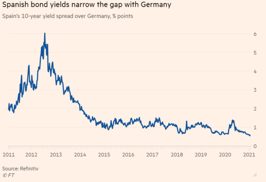 According to The Financial Times, ''The record demand for the Spanish bond underscores the strong start to the year for bonds in the euro area’s so-called periphery, its riskier sovereign borrowers, against a broader sell-off in fixed income markets. Spain’s 10-year spread — the additional yield demanded by investors to hold Spanish debt rather than its ultra-safe German equivalent — earlier this week hit its lowest level since before the region’s debt crisis a decade ago, reaching just below 0.55 percentage points.'' @TommyStubbington