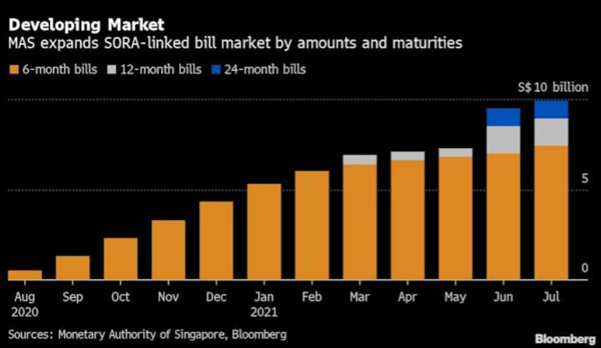The global reform of benchmark money-market was sparked by evidence emerging in 2008 that European and U.S. lenders had manipulated rates to benefit their own portfolios. Going forward, Singapore dollar-based interest rate derivatives are expected to be predominantly SORA-linked. Since August last year, the Monetary Authority of Singapore has been issuing floating-rate notes that are linked to the new benchmark. The outstanding amount of the securities has soared 20-fold to S$9.9 billion in the past year. Source: Bloomberg