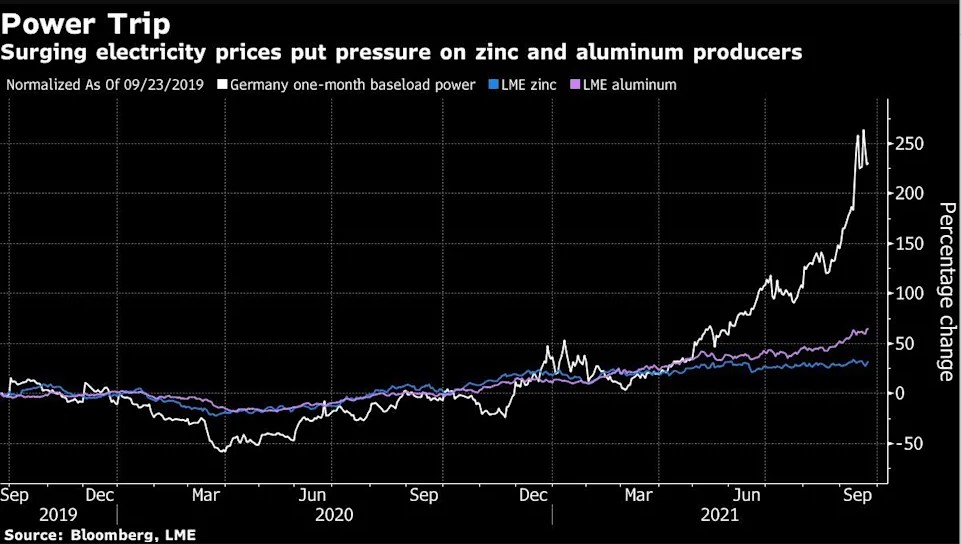 Zinc producer Nyrstar NV said Thursday that it’s curtailing output at a major Dutch plant during peak times of day, highlighting how the spike in power prices is jeopardizing metal supply. For regional aluminum producers, electricity costs could equate to as much as 2,000 euros ($2,345) a ton, about 80% of the commodity’s overall price, Eurometaux said. @Bloomberg