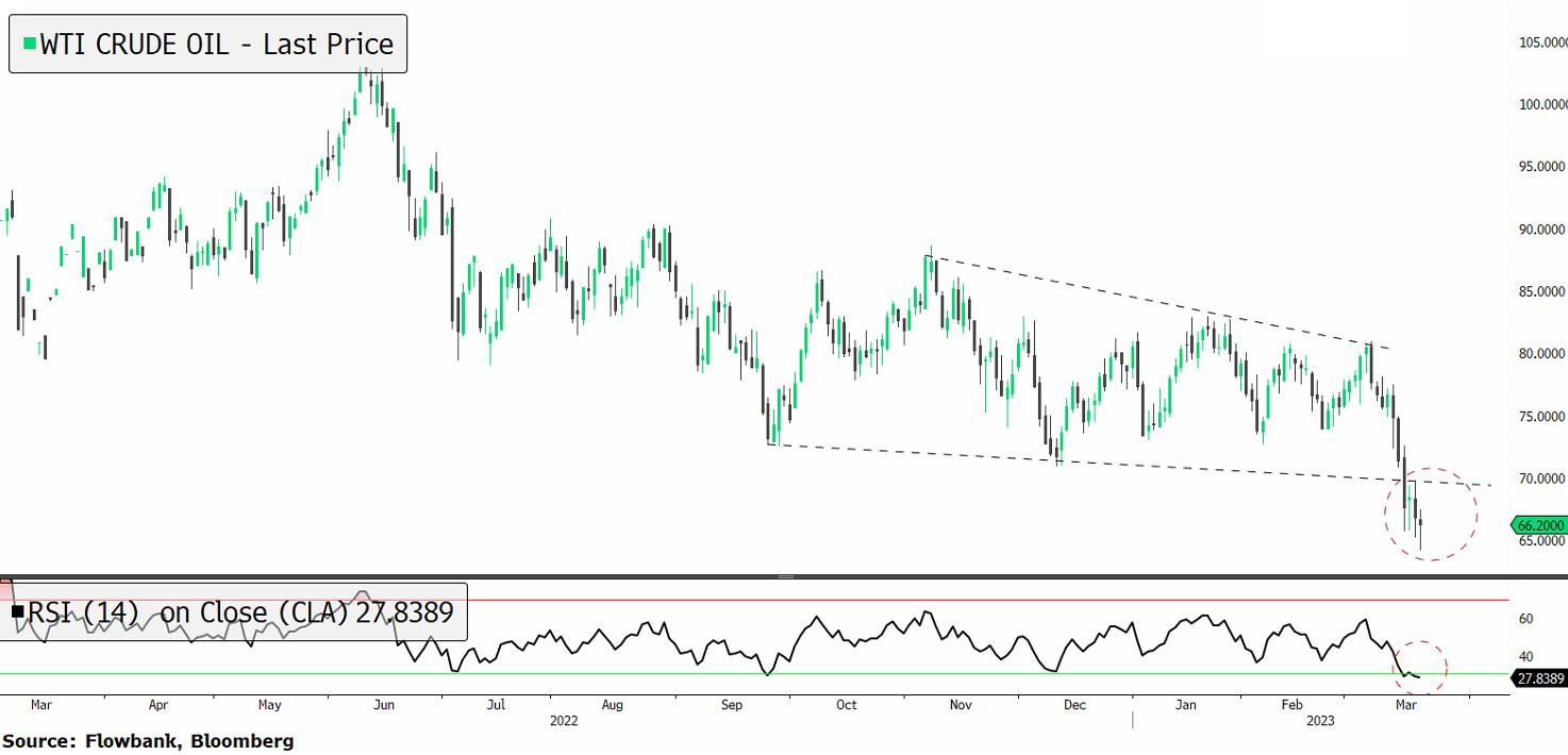 The banking stress has caused traders to panic over future oil demand. Looking at the RSI indicator, WTI Crude oil appears oversold after the recent fears over a possible hard landing.