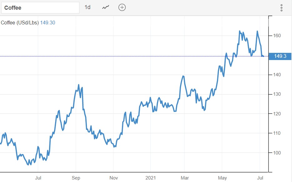 Arabica coffee futures on ICE traded above $1.5 per lb in July, hovering around 2016 levels, as concerns about a decline in Brazil crops due to frosts and cold air mass in coffee-growing states outweighed strong harvest in Indonesia. Also, increased demand due to the success of the vaccination rollout in the US and elsewhere, along with a strong earnings season from Starbucks, Keurig Dr Pepper, and Tata Coffee is expected to provide additional support.