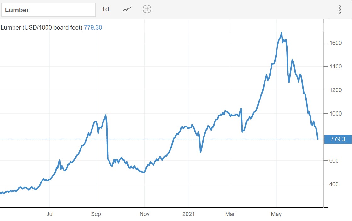 Wood extended its losses to trade below $800 per thousand board feet, the lowest levels since January and moving further away from an all time high of almost $1,700 seen in May. Demand continues to slow while sawmills invest to increase output. Vaccinated Americans started to travel, book holidays, and engage in activities that were restricted by the pandemic, instead of spending on home renovations and DIY work. Also, higher building costs and a declining availability of wood are starting to weigh on the market and slowing the strong pace of homebuilding. Although supply-chain disruptions persist and very few new mills are built, the rapid decline in lumber prices from mid-May suggests a bubble has burst. Still, the housing deficit in the US hints construction will remain a bright spot in the coming years, with prices of lumber remaining above pre-pandemic levels for some time.