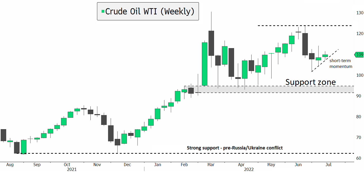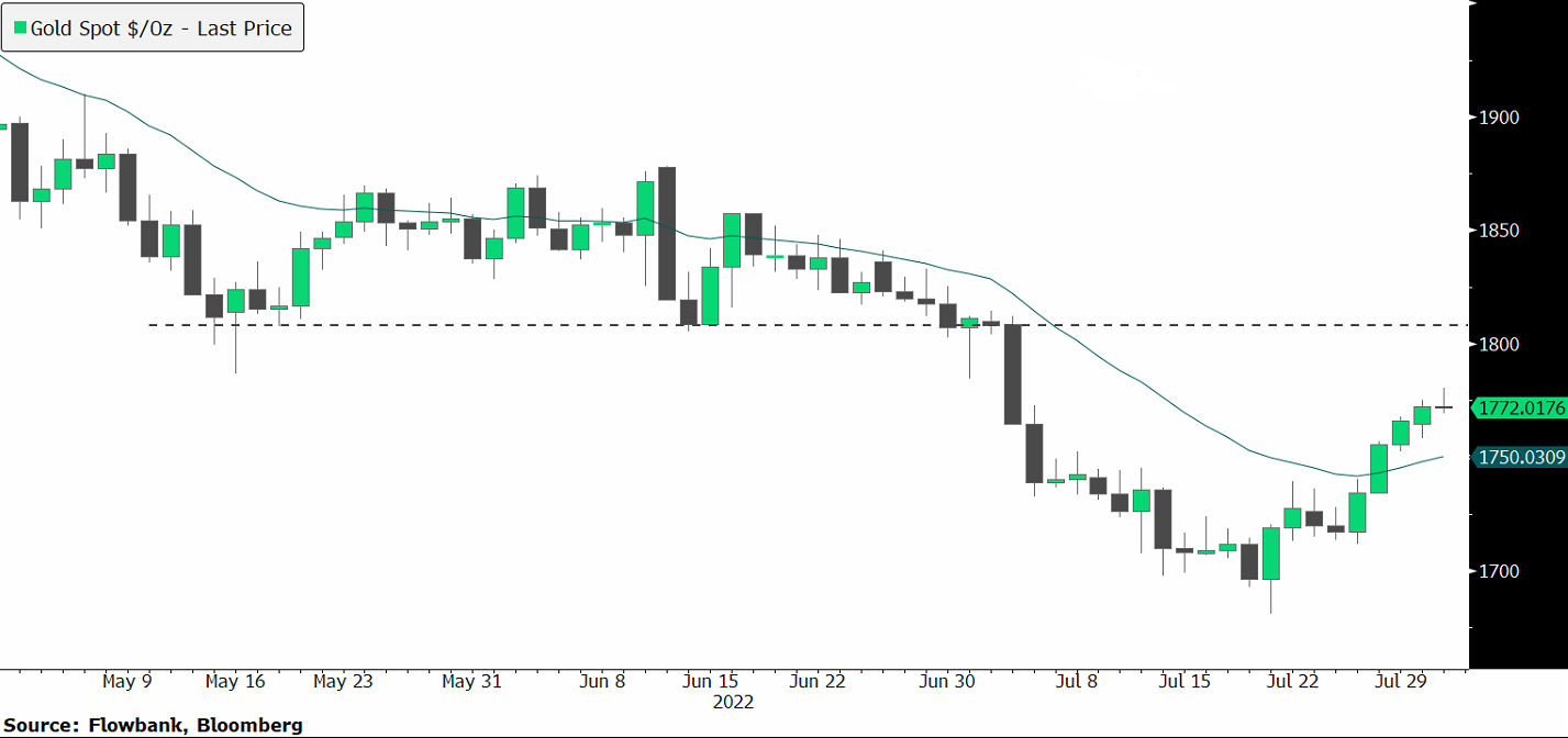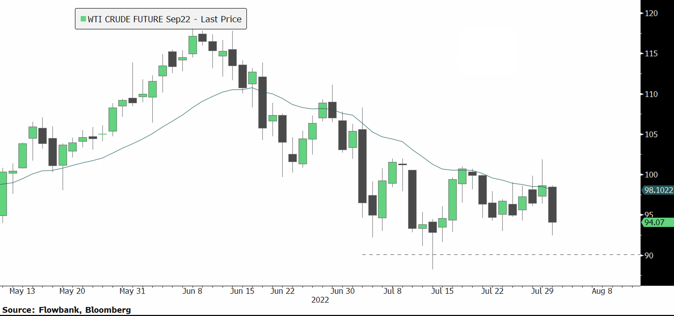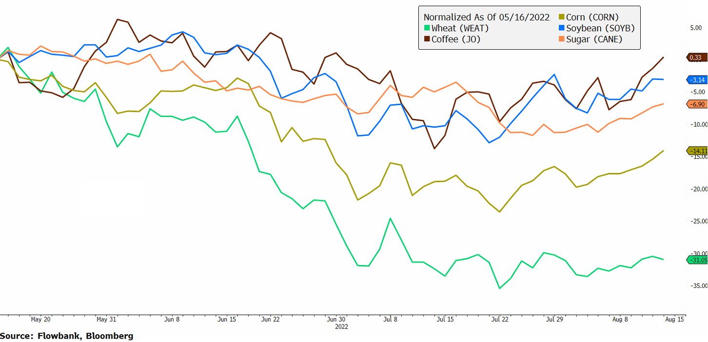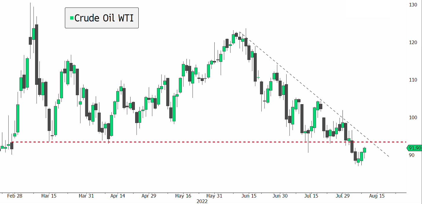 Most soft commodities have fallen sharply since mid-May, with wheat declining the most (31%), supporting the thesis that inflation may have peaked in June. Similarly, oil (WTI) peaked on June 8th at USD122 after supply worries somewhat faded and concerns around falling demand surged. It is now trading below USD88pb, down 4.5% today on global growth worries triggered by weak macro data from China for the month of July. The poor figure caused China's central bank to announce a surprise interest-rate cut. Markets still expect interest rates in the US to increase by 50bps next month, followed by another 25% bps hike later on.