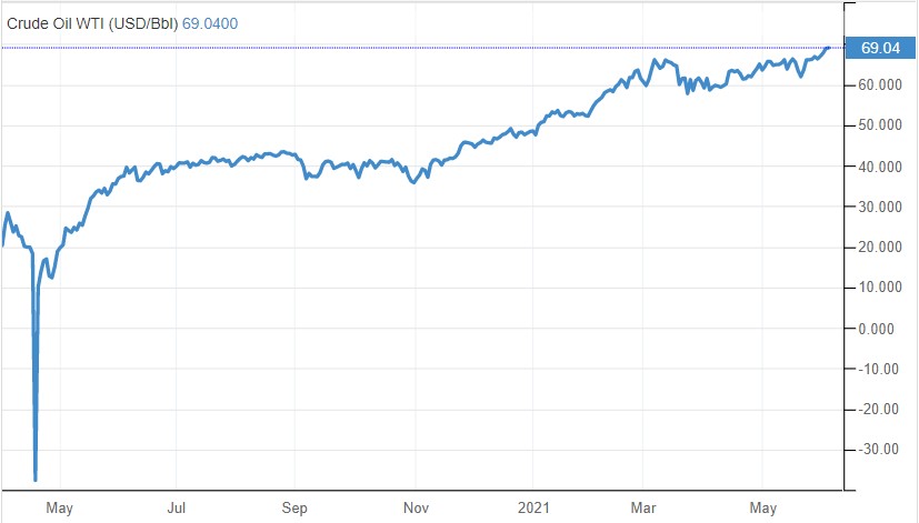 Oil price rise extends to two year high not seen since 2018. This comes amid signs of recovery in demand in the US, Europe and China--vaccines allowing for more mobility enables further growth. Supply side: OPEC agrees to lower supply through July (price up).
