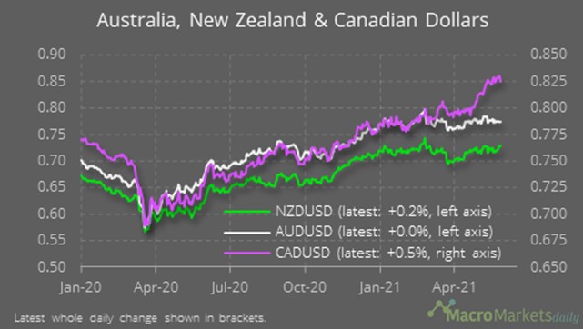 After rising sharply earlier in May, maybe because of mixed signals from the BoC, the Canadian Dollar hit a ceiling against the USD. On the other hand, the NZD has broken out above its prior trading range this week. The AUD is looking flat, but if the recent trend for softer iron ore prices keeps up, the AUD could head southwards. Given the importance of commodities to these economies, the hawkish signals from their respective central banks will sustain if high commodity prices continue.