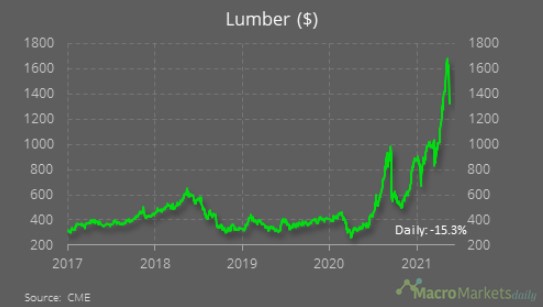 Lumber prices ease further this week despite a relatively high spot price on a historical basis. In the past few trading days the price has fallen about 19% and the futures curve has been in backwardation--which is when the futures prices are below the spot price. Traders should expect the supply constraints to ease and the price to henceforth fall.