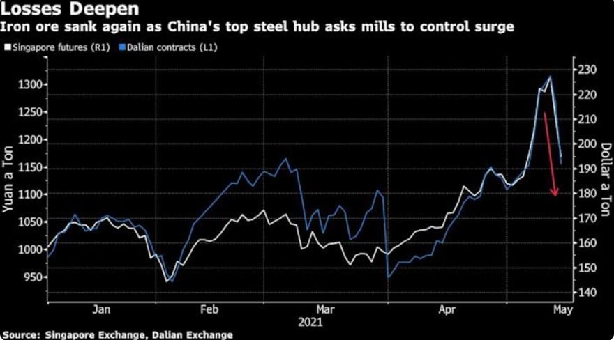 Futures in Dalian dropped the daily limit, while prices in Singapore extended a slump from a record $233.75 a ton on Wednesday amid concerns about the sustainability of the rally. In the latest move aimed at containing prices, the steel-making hub of Tangshan banned steelmakers from fabricating or spreading price-hike information. That follows comments from Chinese Premier Li Keqiang this week about the need to deal with surging commodity costs.