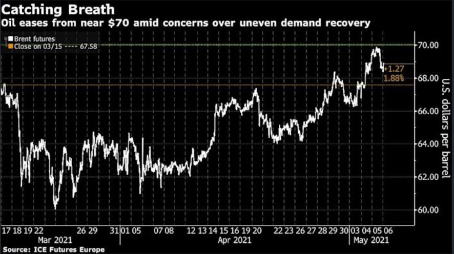 Oil prices are at risk of a correction, according to Bloomberg Intelligence analyst Henik Fung, who cited the threat posed by India’s crisis as well as higher OPEC+ supply. The Organization of Petroleum Exporting Countries and its allies are raising output by about 2 million barrels a day through to July. In the U.S., government data showed crude stockpiles contracted by nearly 8 million barrels last week and exports surged, but gasoline inventories rose for the fifth straight week. Separately, pent-up travel demand in the country is seen spurring a 30% jump in jet fuel use this summer.