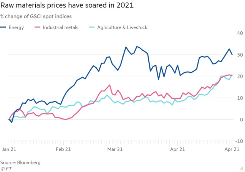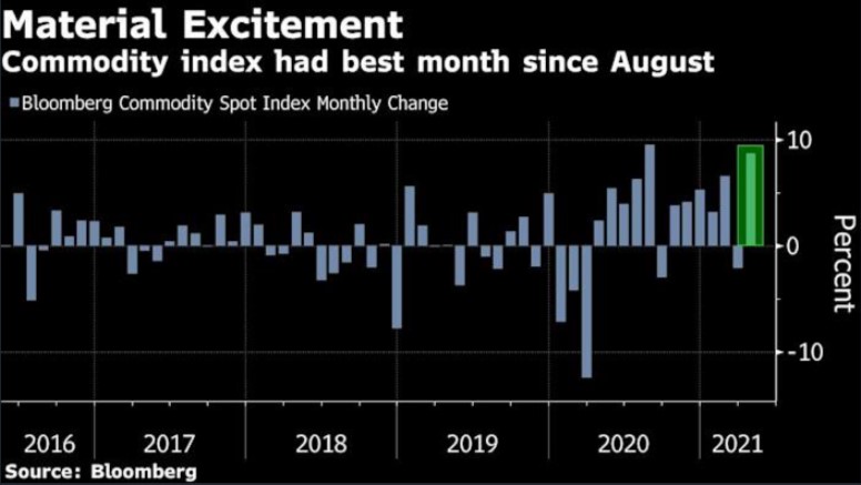 The Bloomberg Commodity Index has climbed 8.7% last month in its biggest jump since August--investors expect more to come, but fear inflation as a result of this. Emerging Markets currency index nears a record after surging 1.5% in April. Global stocks continued on an up trend after increasing 4.2% last month. This strength in commodities (who've surged 65% this past year) invigorates the debates over rising prices, and complicates the outlook in debt markets.