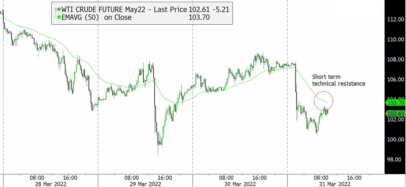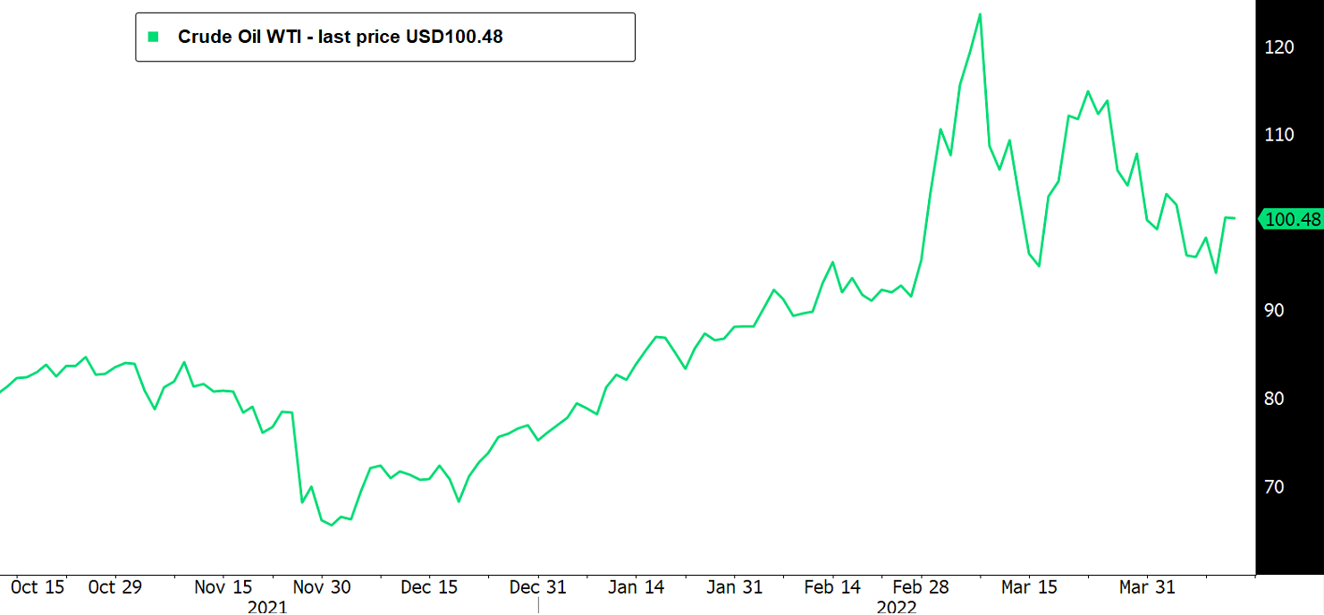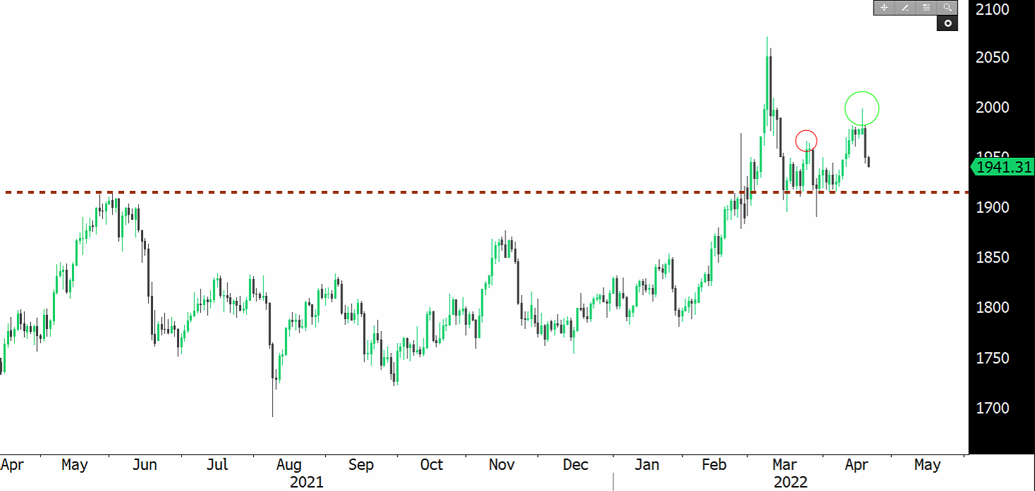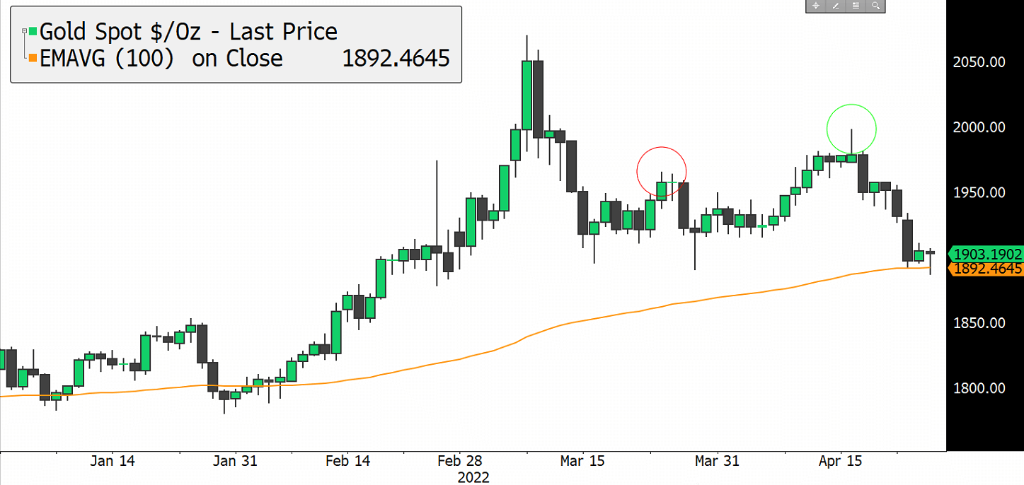 The yellow metal after briefly touching the 2'000 level is back down to USD1'900, a support provided by its EMA so far. Gold's rally this year has been partly predicated on the view that the surge in commodity prices will make already hot inflation persistent. However, that might no longer be the case as future growth is becoming uncertain due to multiple factors, notably, China's zero Covid policy, the war, and Fed's attempt to cool down the economy.
