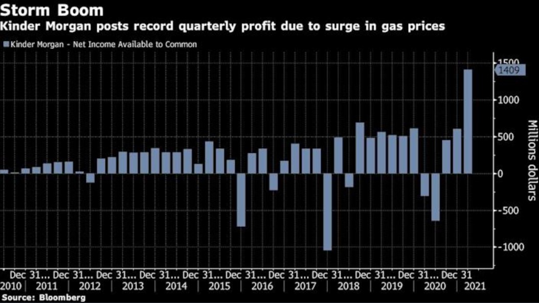 Kinder Morgan sees abnormal net income figures on account of surging gas prices. Net income reached a record $1.41 billion more than doubling from the $550 million analyst estimates. Drillers such as Comstock Resources also reaped large profits.