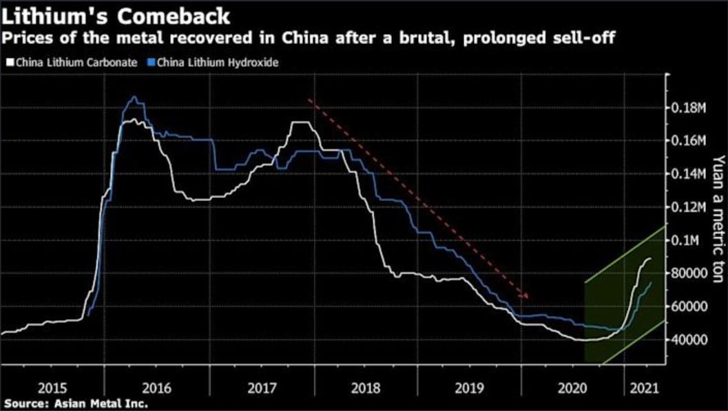 Lithium-ion batteries represent 30% of EV cars cost and with lithium prices rising again, it could mean the input good makes cars more expensive or bottom lines smaller for carmakers.
