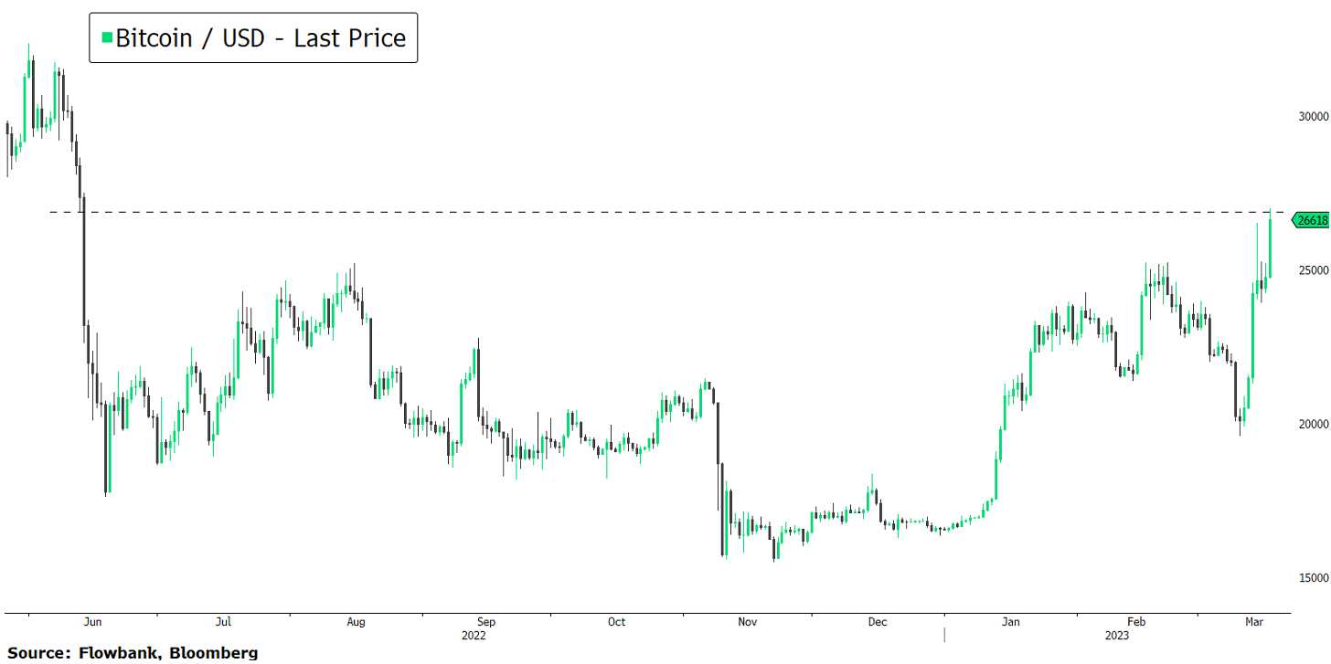 Bitcoin jumped over the last few days in light of tumbling US Treasury yields and uncertainty in the banking sector. It has now advanced by 60% this year alone. All eyes will be on the Fed next week, which could add volatility to Treasury yields and in turn Bitcoin.