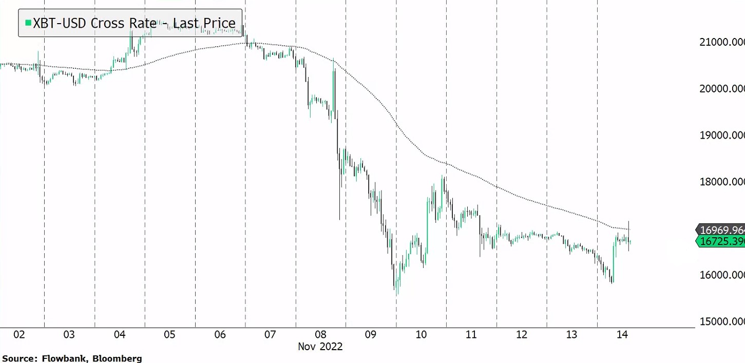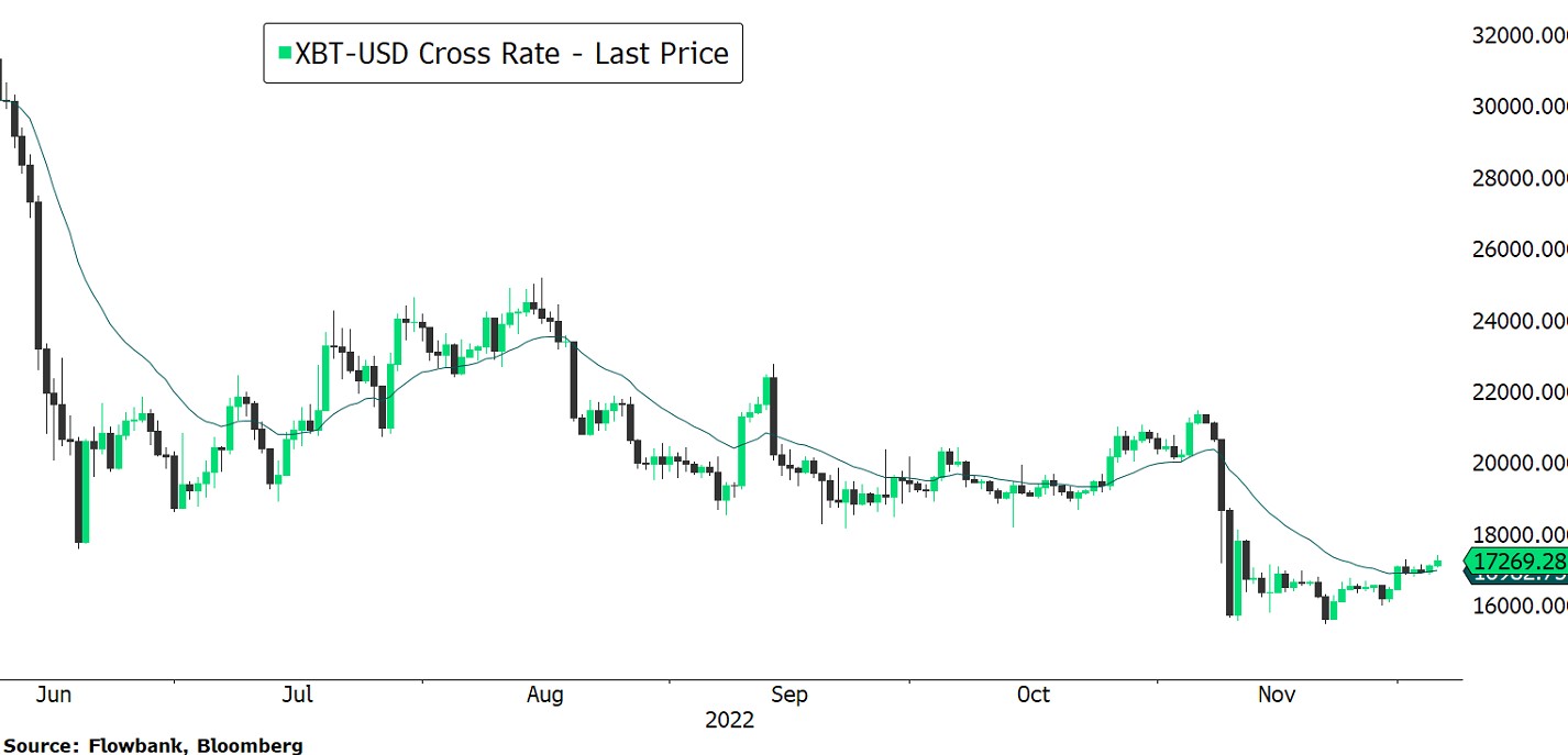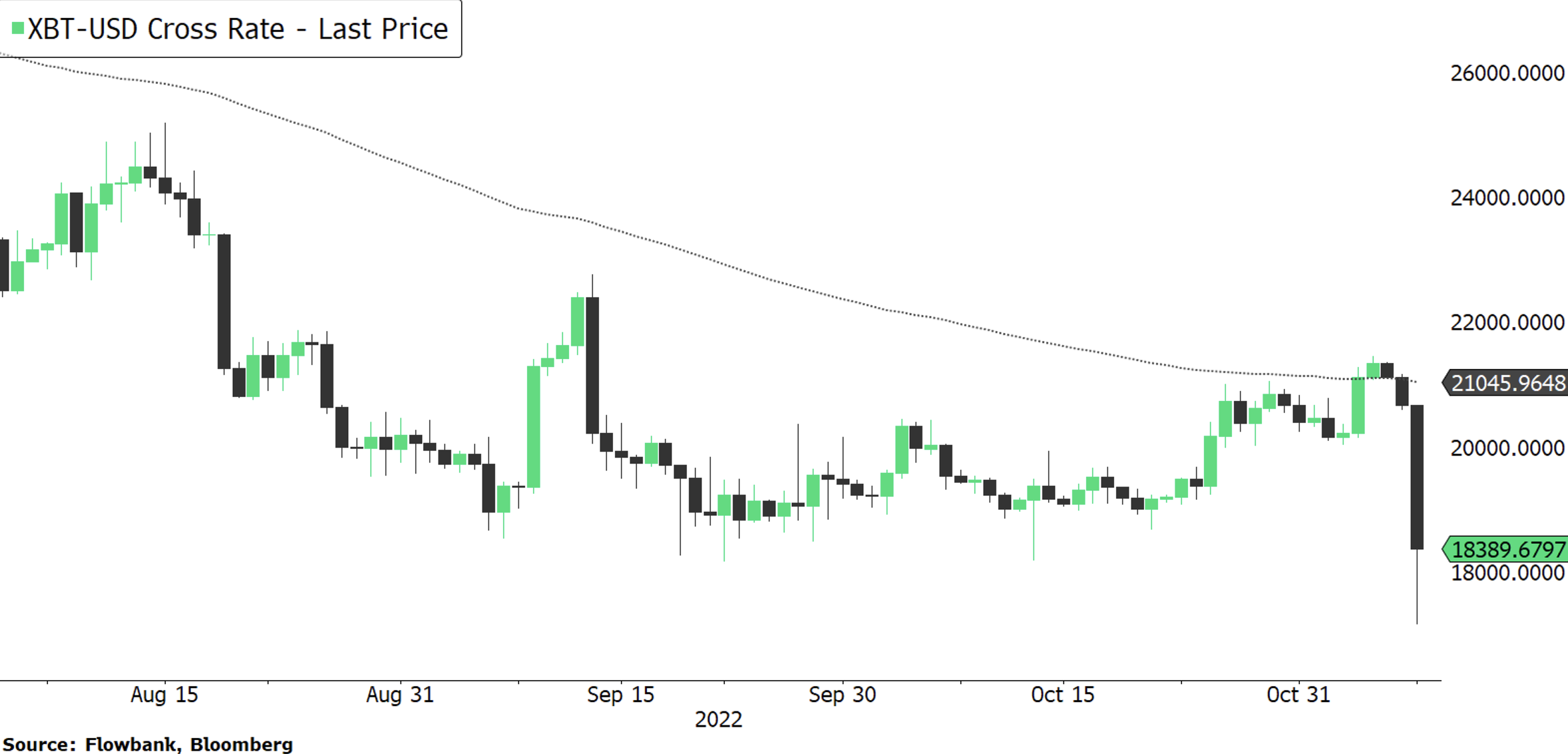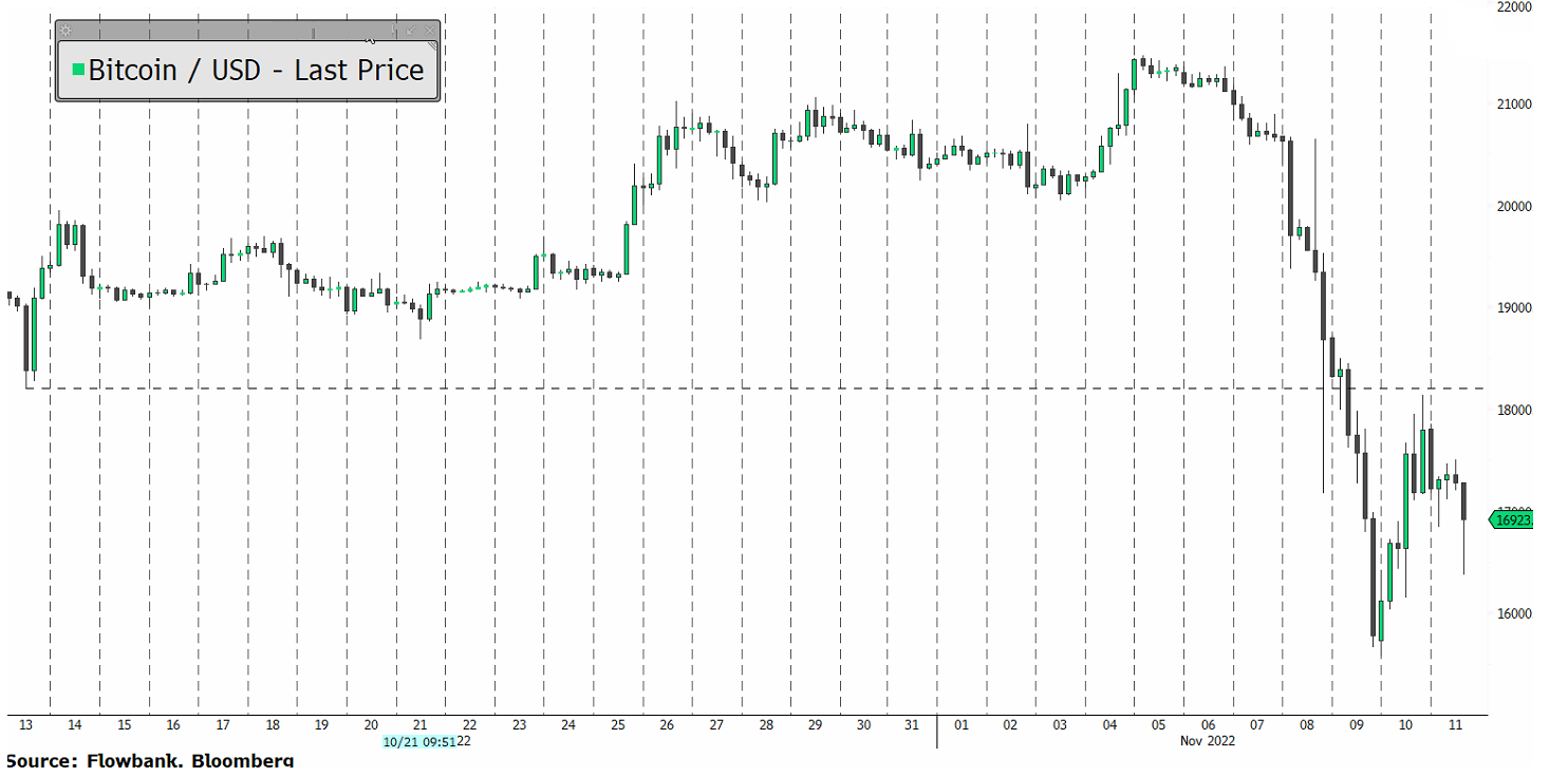 Bitcoin fell to as low as USD17'484, the lowest level since Nov. 2020, after Binance, the world's largest crypto exchange, said it had signed a letter of intent to acquire the non-US assets of rival FTX, which faces a "significant liquidity crunch." Many crypto-related stocks such as Robinhood, Silvergate, and Coinbase fell as investor confidence in crypto took a hit.
