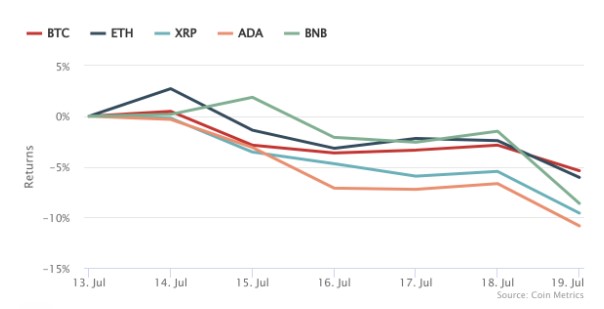 The returns of the top six crypto assets over the last week were as follows — BTC (-5.38%), ETH (-6.05%), BNB (-8.61%), XRP (-9.58%), and ADA (-10.84%). Source: Coin Metrics