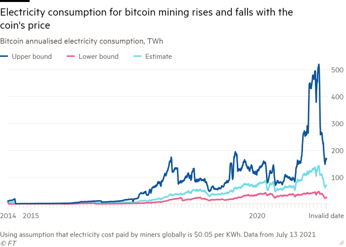 Bitcoin mining consumes approximately 70 terawatt hours of electricity a year exceeding Austria's annual consumption. Consumption seems to follow Bitcoin's share movement. Indeed, it plummets with Musk's tweets over concerns, and rises when prices rally. Source: Financial Times