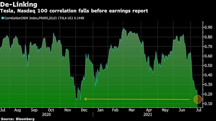 Bitcoin may be at the heart of the fall (0.83 to 0.14) of Tesla and Nasdaq's correlation that has been going for 20 days. Indeed, Tesla being exposed to Bitcoin, its volatility impacted Tesla's earnings while Nasdaq 100 rose. Source: Bloomberg