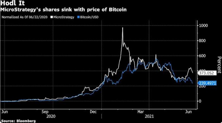 The recent plunge in the price of the world’s largest cryptocurrency has taken the momentum out of MicroStrategy Inc. shares, which became a proxy for Bitcoin after CEO Michael Saylor began amassing the digital tokens last summer. And at one point Tuesday, Bitcoin’s slide to below $29,000 helped take MicroStrategy’s stock down as much as 12%. Shares closed 5% lower on Tuesday at $553.72.