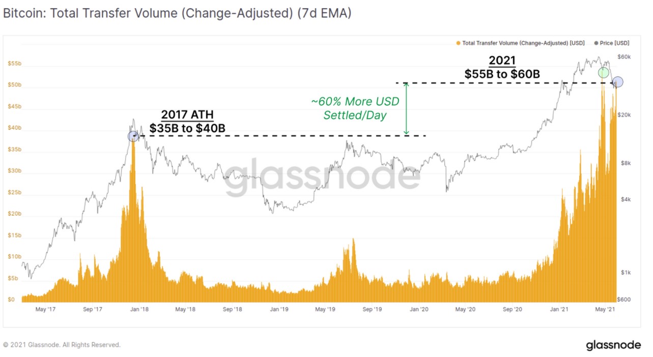 On-chain settlement in USD terms is close to an ATH this week with $55B settled per day. This is 60% more volume than the 2017 peak. This is a huge volume of coins on the move. According to Glassnode, this movement is driven mainly by short term holders--in contrast, long term holders of BTC are more reluctant to sell at a depreciating price despite taking profits during the early 2020 rally. There appears to be a fight between HODLer conviction and immediate buying power.