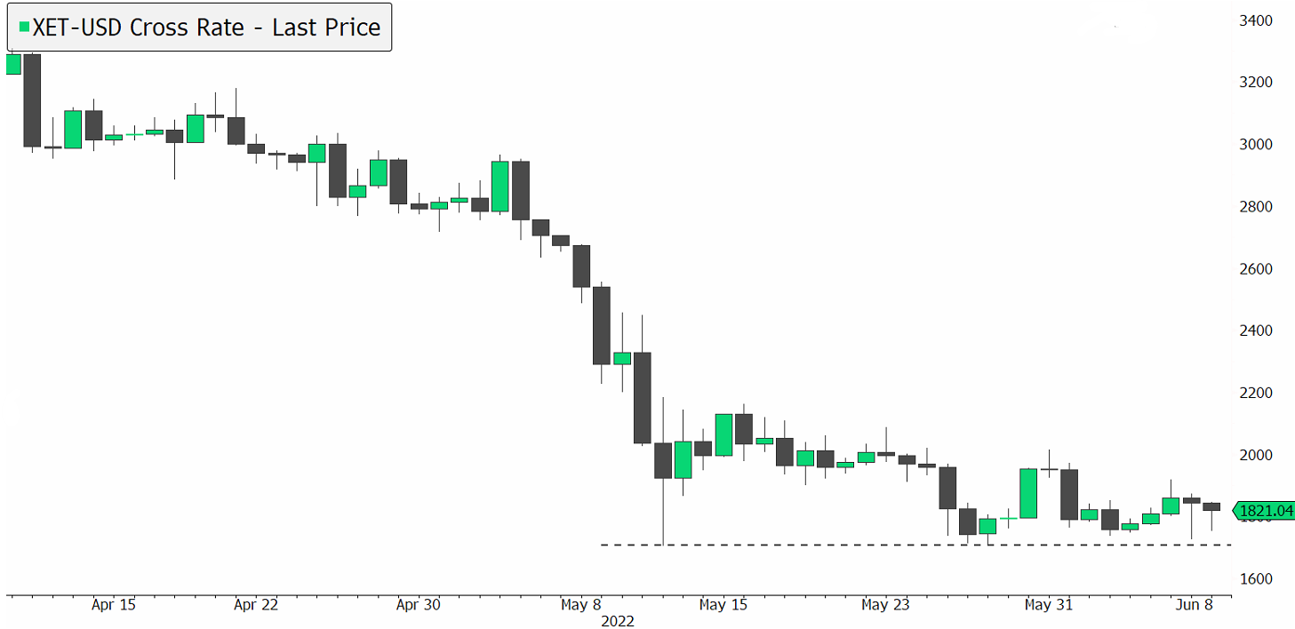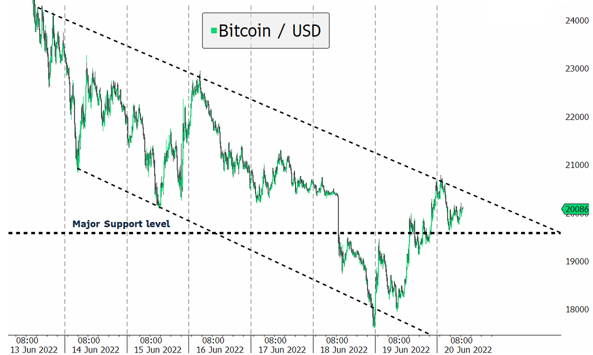 Bitcoin trades higher on Monday, above the key psychological level of USD20'000, after falling below USD18'000 over the weekend. Traders fear liquidations could worsen the crypto rout. Nonetheless, the rebound points to some investors seeing the 58% loss year-to-date and 30% downfall in just 1 month, as an opportunity to buy. For many DeFi apps the volatility means reducing exposure to protect their ecosystem. On a technical picture Bitcoin still trades in the range we highlighted last Friday with a descending triangle that could soon see a swift move in either direction. Support level still holds at USD19'500. With the intense selling pressure recently, chances of a rebound are increasing.