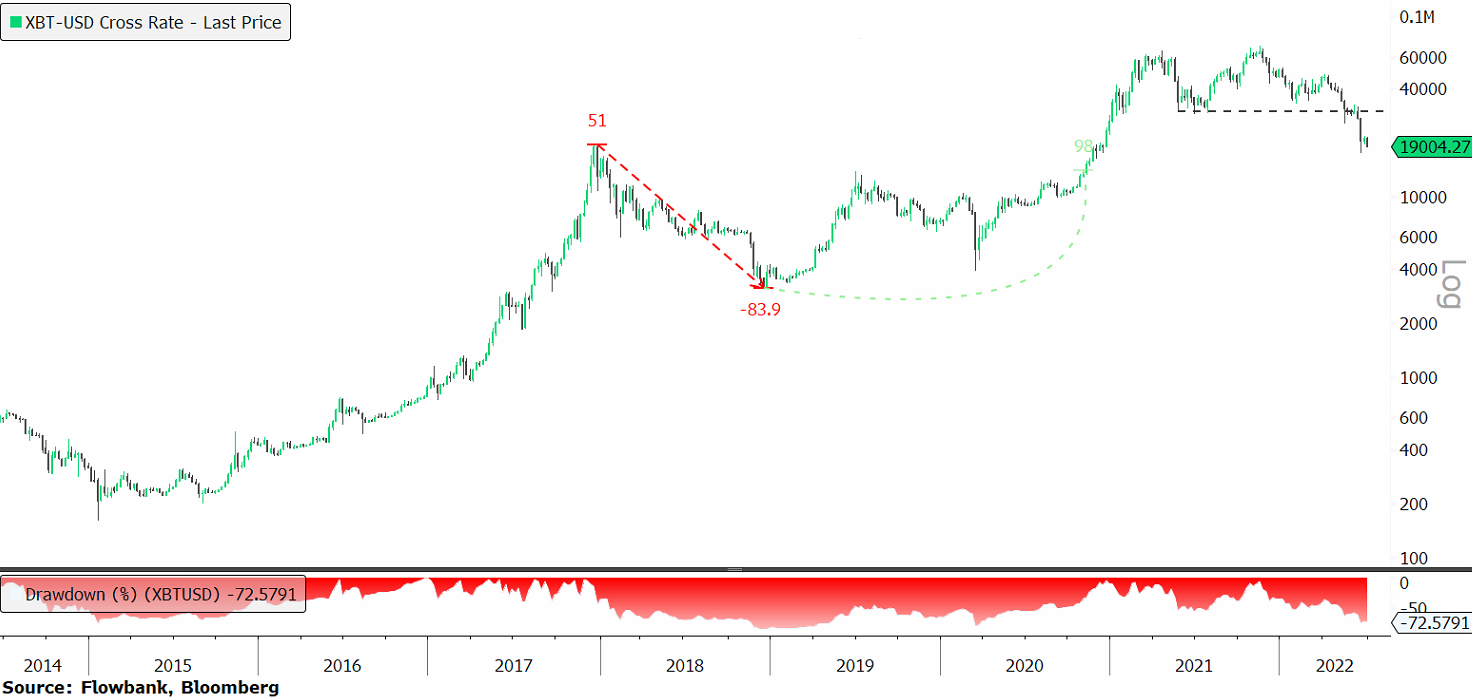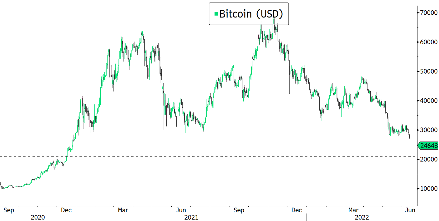 Bitcoin is quickly approaching prices not seen since December 2020, as risky assets selloff in fear of rising rates and investors capitulating to the market pressure. The next major support level is USD20-21k. In order to get there, at USD24'800, Bitcoin would need to drop another 15%. Below it, USD11k would be significant support. Accelerating the selloff in crypto is a tweet by Celsius Network, a crypto lender that it is pausing all withdrawals, swaps, and transfers on its platform, and a competitor announcing a bid for its assets. Rumors have it the crypto staking and lending platform could be dealing with a major liquidity crisis and some users believe the team may have mismanaged the funds. It is believed to have over USD10 bn in assets.