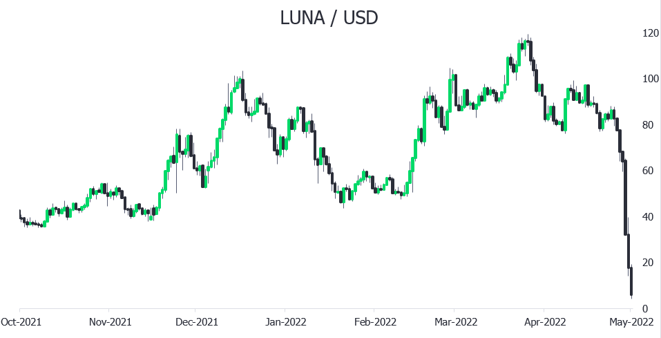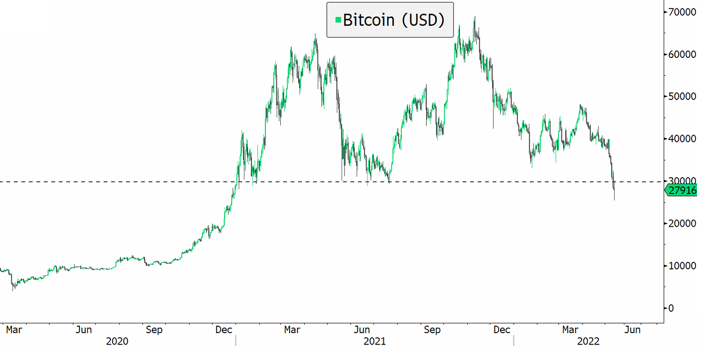 Bitcoin fell as much as 6% on Thursday, close to below USD27'000, the lowest since December 2020. The key question is whether it will be able to regain its key support level of around USD29'800. The downfall of the stablecoin UST has impacted the crypto market and it is unclear if markets are close enough to peak capitulation in order to rebound. There are some signs of capitulation such as forced selling and markets are largely oversold after falling rapidly.