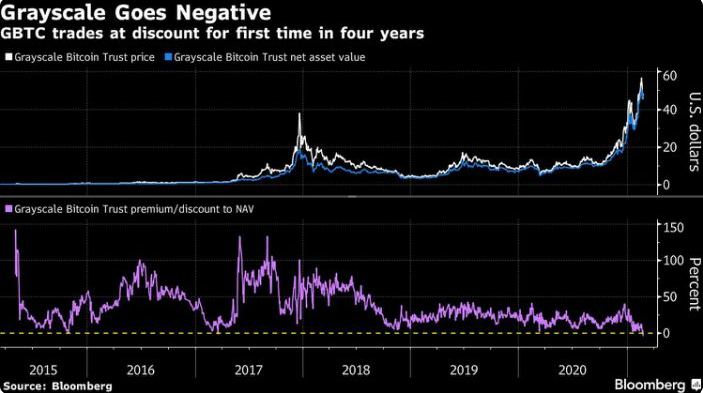 The $32 billion Grayscale Bitcoin Trust has plunged 20% this week, outpacing a 13% decline in the world’s largest cryptocurrency. GBTC’s once-massive premium to its underlying holdings has evaporated as a result, with the price of GBTC closing 0.7% below its underlying holdings on Wednesday -- the first discount since March 2017. Source: Bloomberg.