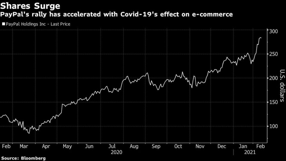 Analysts expect PayPal’s bid for more growth -- particularly through its ground-breaking move into cryptocurrency -- will be a key focus at the event on Thursday. Shares have soared 135% in the past year, propelled by a shift to digital commerce amid the pandemic. Its market value of about $331 billion exceeds most large banks, including Bank of America Corp., Citigroup Inc. and Wells Fargo & Co., and almost matches Mastercard Inc.’s of $332 billion. The stock touched an all-time high on Feb. 9 as Bitcoin blew past another record. Shares also rose after better-than-expected earnings last week. - Bloomberg