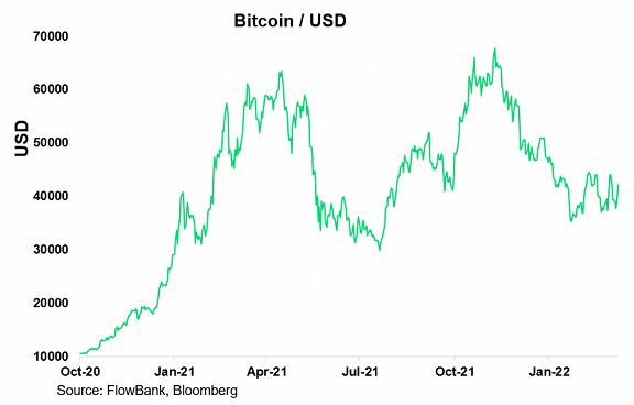 Prospects of Fed hikes, inflation, and slower growth have hit sentiment for growth assets, including crypto. Bitcoin is now sitting just above USD40'000, after dropping below the key level. Buyers showed interest below USD40'000, as the cryptocurrency rebounded after spending a couple of hours hovering between USD39'400 and USD39'900. Bitcoin is now firmly in a range of around USD36'500 and USD47'500.