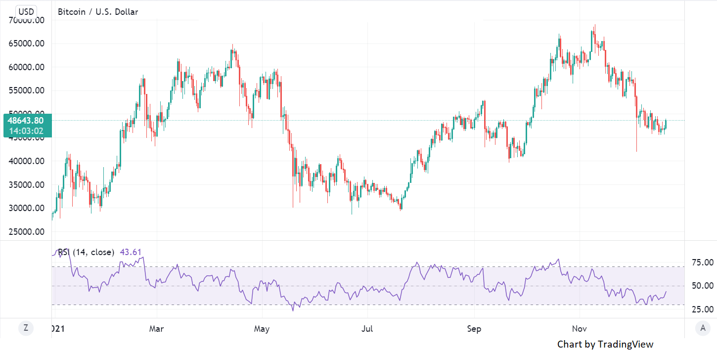 In a volatile session the leading crypto reverses course shooting back from ~45,600 to $48,600 currently. The sudden move may be attributed to the sudden reversal in risk-sentiment improving after strengthening stock markets, and bitcoin touching key support levels. The Relative Strength Indicator (RSI) currently stands close to ~44, well off the ground from its oversold level of ~30, touched on 10th of December.