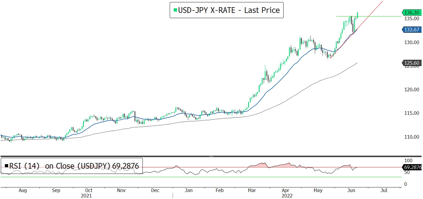 The Japanese yen is in free fall, with the pair USDJPY hitting 136.30 its lowest point since late 1998! The weakness against other major currencies comes as the Bank of Japan has decided to stick to its loose policy contrary to its global counterparts, which are raising interest rates to fight inflation. The spike in USDJPY followed today's Japan's Prime Minister's intervention where he voiced his support for maintaining the current course of the monetary policy by the BoJ.