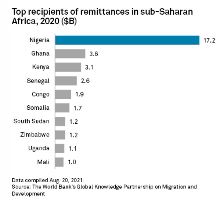 Remittances to Nigeria were $17.2 billion in 2020, down 27.7% year-on-year, according to the World Bank, which attributed the decline to a 27% premium on the naira-dollar black market exchange rate and the central bank's directive that local exchange houses pay out remittances in hard currency. Total remittances also declined 2.1% in 2019 versus 2018. Source: spglobal