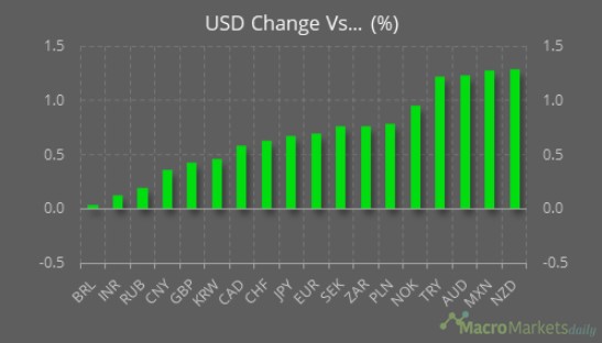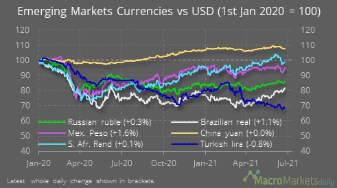 ''A surprise rate hike by Mexico’s central bank yesterday caused the peso to rise by 1.6% against the USD yesterday, with the Brazilian real also doing well. The strong performance of Brazil’s currency, where the central bank has also been hiking, stands in sharp contrast to the performance of the Turkish lira, which continues to depreciate amid the more dovish central bank actions there. Most analysts expect further rate hikes from Mexico and Brazil, which could lead to further FX divergence.''