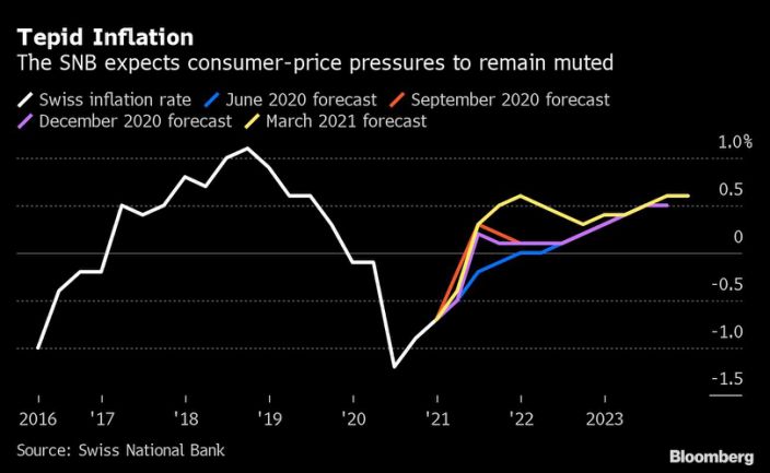 The Swiss National Bank kept interest rates at record lows and pledged to continue its policy of foreign-exchange interventions as the economy remains vulnerable due to the pandemic. Officials led by President Thomas Jordan reiterated that the franc is “highly valued,” and also kept both the policy rate and deposit rate at -0.75%, as predicted by economists. Although the currency’s drop to a 20-month low against the euro in recent weeks has given officials some respite, inflationary pressures remain weak and the slow deployment of Covid-19 vaccinations is crimping economic activity.