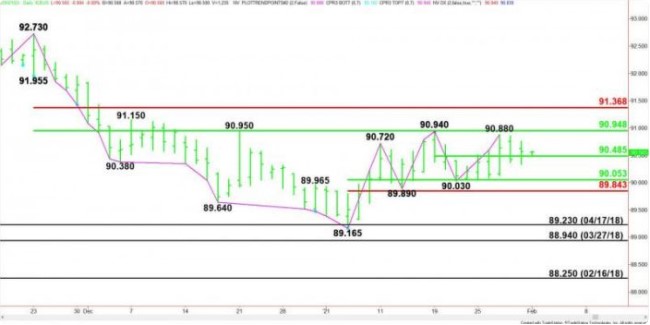 ''A sustained move over 90.485 will indicate the presence of buyers. If this move can create enough upside momentum then look for the rally to extend into 90.880 to 90.948. Taking out 90.948 will indicate the buying is getting stronger. This could trigger an acceleration to the upside with the next potential target 91.370. However, a sustained move under 90.485 will signal the presence of sellers. If this generates enough downside momentum then look for a possible test of 90.055 to 89.845. The latter is a potential trigger point for an acceleration into 89.165.''-Bloomberg