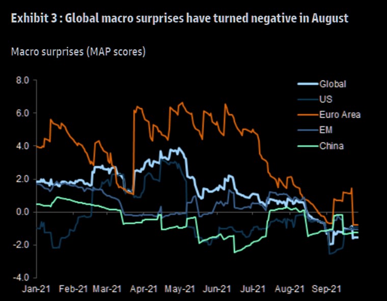 Expect more range-bound returns and see potential for volatility to linger as long as macro surprises remain negative. Maybe we'll see lower equity returns owing to elevated valuations, fewer growth tailwinds and more rates headwinds, as well as margin pressures from supply disruptions and taxes. Call overwriting is more attractive considering the high volatility risk premia and limited right-tail risk near-term. Correction risk remains elevated as long as macro surprises are negative but based on our volatility regime model we would not expect a transition to a sustained high vol regime. @GS