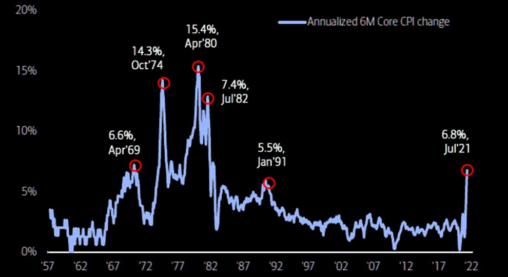 Inflation has soared in 2021 and it is highly unlikely to vanish as quickly as it appeared given the structural changes (War against Inequality) and pandemic unintended consequences (supply chain dislocation); in the past 6 months the annualized rate of CPI inflation was 7.8%, of core inflation was 6.8% (Chart), US house prices was 19.7% (May) and "pipeline inflation" PPI's are popping higher in US/China/Japan. Source: The Market Ear