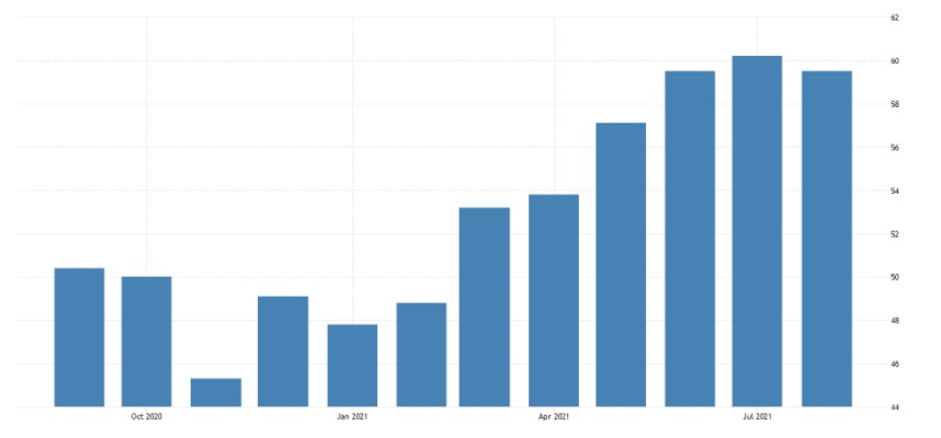 The IHS Markit Eurozone Composite PMI edged down to 59.5 in August from a 15-year high of 60.2 in July and compared to forecasts of 59.7, preliminary estimates showed. Still, the reading pointed to one of the strongest rates of growth over the past two decades although supply chain delays persisted. Service sector growth exceeded that of manufacturing for the first time since the pandemic, buoyed by the further reopening of the economy. Source: Trading Economics