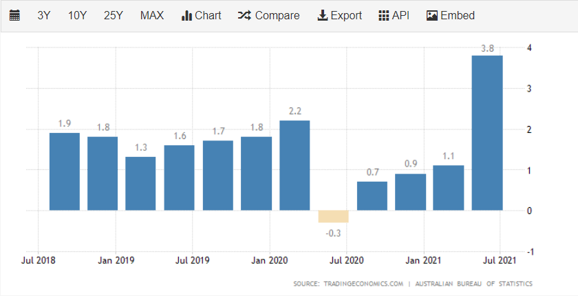 Australia's annual inflation rate increased to 3.8% in Q2 2021, up from 1.1% in Q1 and in line with market expectations. This was the highest reading since Q3 2008, indicating some base effects from free child care and a record drop in gasoline costs in Q2 2020. Source: Trading Economics
