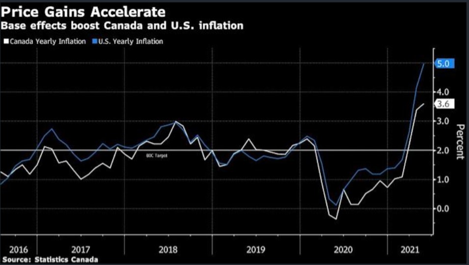 The Bank of Canada -- which is responsible for keeping inflation in check -- is brushing off the spike, arguing it is being driven largely by one-off factors. The annual reading is distorted by year-ago comparisons when price fell sharply at the beginning of the pandemic, a phenomenon known as the base effect. Price pressures may also be building as businesses scramble to balance a rush of demand against shortages of materials.