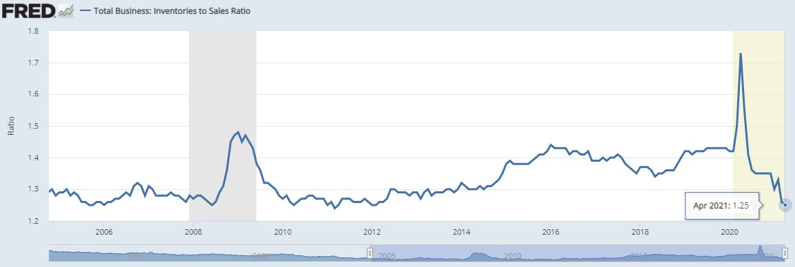 Loads of US data yesterday, and one of the less watched ones was business inventories. The data showed that the inventories-to-sales ratio fell further in April and is now far lower than in the years prior to the pandemic. Very low inventories could be linked back to inflation, which makes it more expensive for businesses to produce goods if prices stay the same--in this case, it's not so much that sales are booming, but rather that inventories are being squeezed.