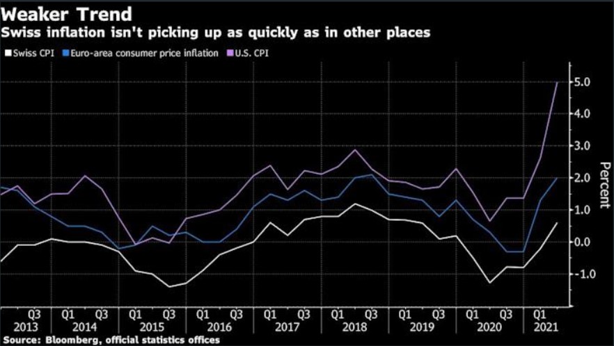 Swiss National Bank sees inflation as a far off phenomenon. In fact, in Switzerland, inflation remains below 1%. The Swiss economy is resurging faster than neighboring economies despite suffering its worst contraction in decades.
